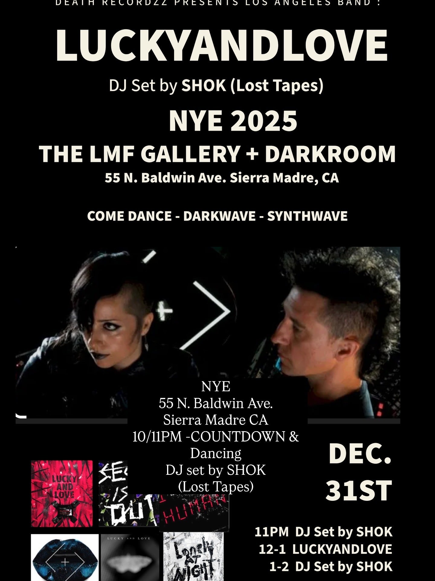 Synthwave / Post Punk / Electro synth band "Luckyandlove" play the gallery at 11PM and SHOK will DJ the night! Come ring in the new year. All ages. FREE - come see the show on the walls and dance in the new year with The LMFLA 55 N. Baldwin Ave. Sierra Madre, CA 91024 (East Pasadena)
