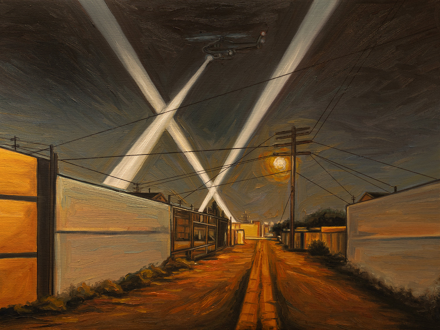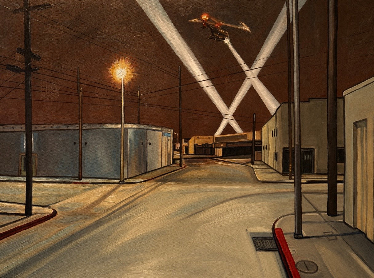 This collection mixes personal memories and scenes of the city. I contrast the glamorous side of Hollywood with the reality of neighborhoods in more affordable parts of town. In my work, helicopters - what we call “Night Birds” - hover over cityscapes, clashing with the distant sparkle of premieres and neon lights. These “birds” feel both haunting and alive, symbolizing the unrest and constant activity of the city after dark.